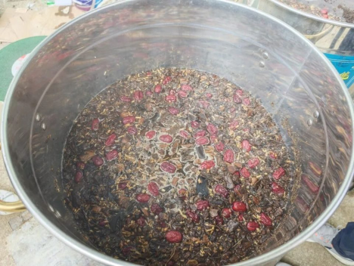 走进基地,工作人员正严格按照配方,精确称取杜仲、山楂、当归、艾草、红枣、板蓝根、黄芪等药材各6斤,经过半小时浸泡和六小时慢火熬煮,滤去药渣后兑入红糖,制成供鸡群饮用的保健汤剂。这套严谨的流程每半月进行一次,熬制的药汤可满足蛋鸡一周的“养生”需求。