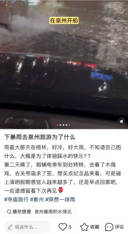 4月3日至6日期间,不少游客在社交平台分享了降雨期间的经历:有游客称 “雨最大那天在梧林,好冷,好大雨,不知道自己图什么,大概是为了体验踩水的快乐”;也有本地网友提醒 “最好雨停了再开车,太危险了”。据泉州网,丰泽区宝洲街、鲤城区中山路、晋江桥南中央广场附近等地均出现较深积水,当晚积水导致多辆车被困。也有晋江网友反馈称,其所在的位置晋江万达广场附近,积水当晚就没了。